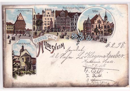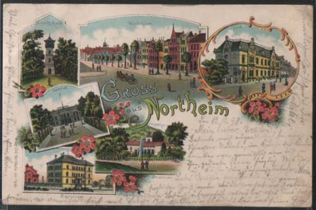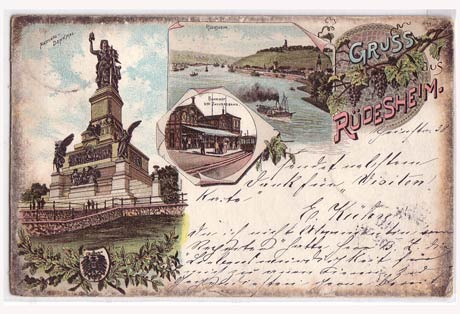 Gruss aus Rüdesheim mit Bahnhof der Zahnradbahn Litho 1898
