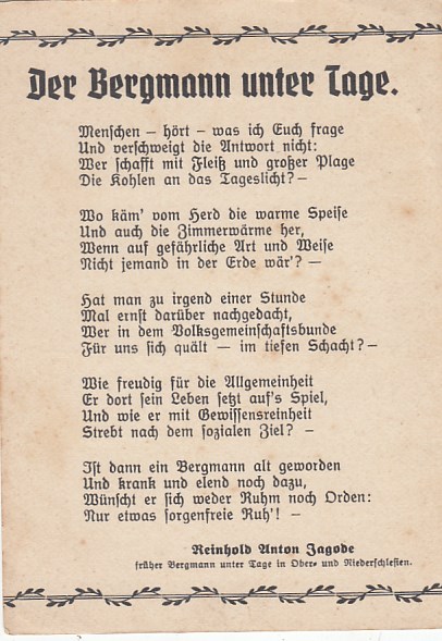 Bergbau Bergmann unter Tage Gedichte Reinhold Anton Zagobe