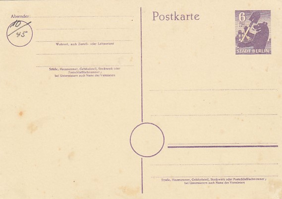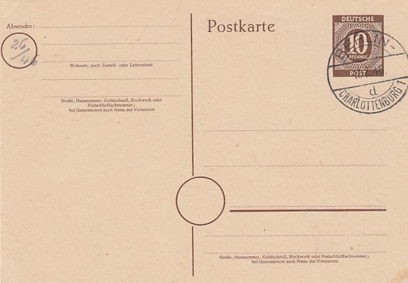 Privatganzsache Postkarte Deutsche Post 10 Pfennig Berlin Charlottenburg 1946