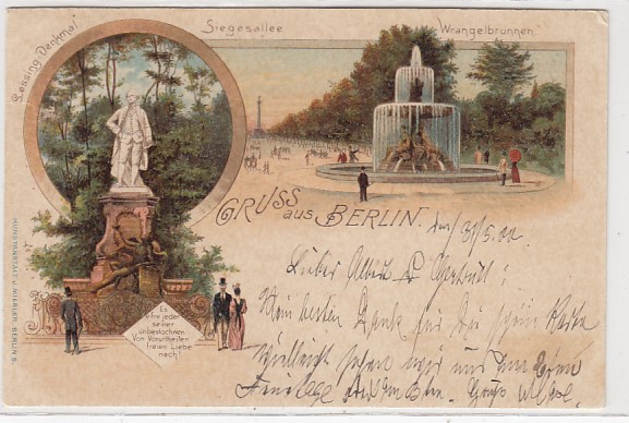 Berlin Tiergarten Litho Ansichtskarte Lessing-Denkmal Siegesallee Wrangelbrunnen 1900