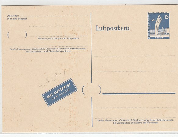 Privatganzsache Berlin Luftpost Tempelhof 15 Pfennig