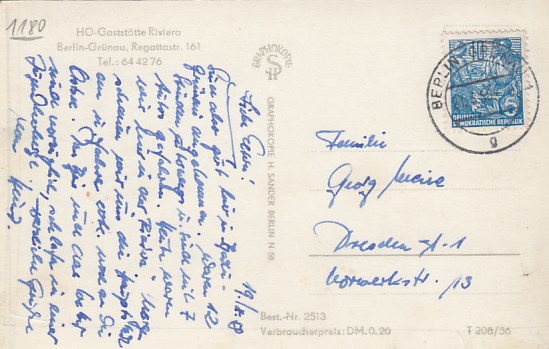 Berlin Friedrichshain Ostbahnhof Bahnpoststempel Berlin - Görlitz 1959