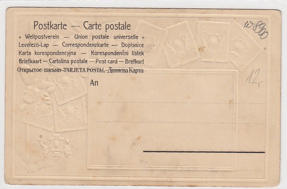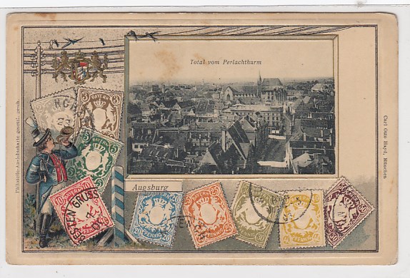 Augsburg Postbote Prägekarte mit Wappen Briefmarken ca 1900