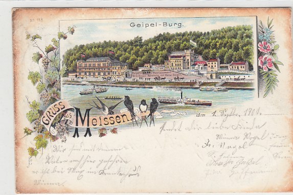 Meissen Meißen Litho Ansichtskarte Geipel-Burg mit Raddampfer 1901