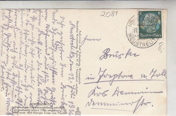 Hohenzieritz bei Neustrelitz in Mecklenburg Schloss 1936