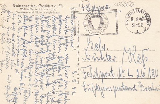 Frankfurt am Main Palmengarten Feldpoststempel 1942 Unfallschutz