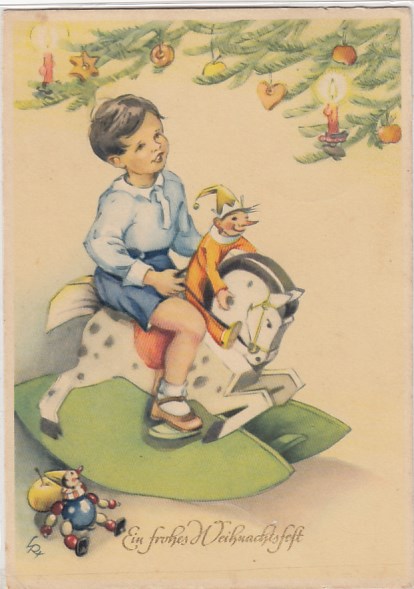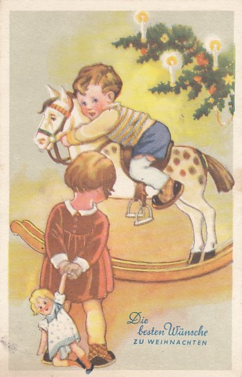 Glückwunsch AK Ansichtskarte Frohe Weihnachten Kinder Schaukelpferd