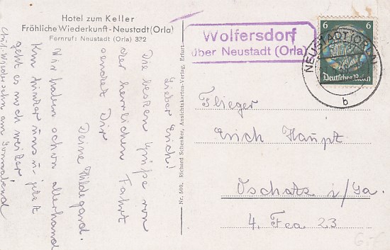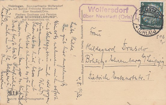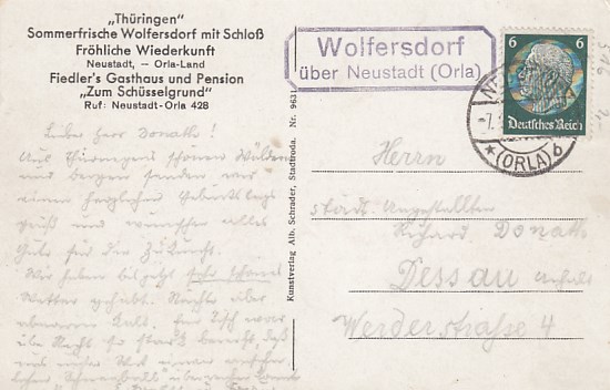 Landpoststempel Wolfersdorf Neustadt Orla Schloss Fröhliche Wiederkunft