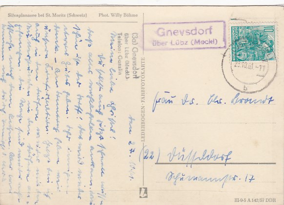 Landpoststempel Gnevsdorf Lübz AK St.Moritz Schweiz