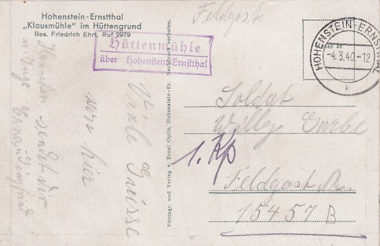 Landpoststempel Hüttenmühle Hohenstein-Ernstthal Feldpoststempel Klausmühle Hüttengrund