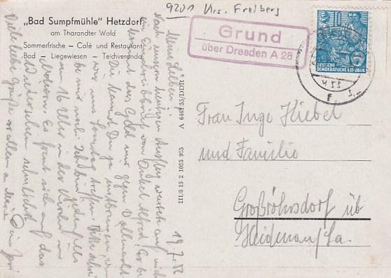 Landpoststempel Grund AK Bad Sumpfmühle Hetzdorf Tharandter Wald