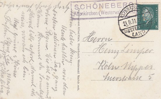 Landpoststempel Schöneberg Altenkirchen Westerwald AK Niederölfen 1931