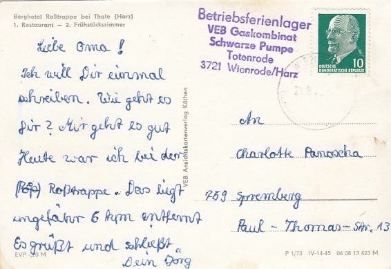 Stempel Kinderferienlager Pionierlager VEB Schwarze Pumpe Totenrode Wienrode Thale