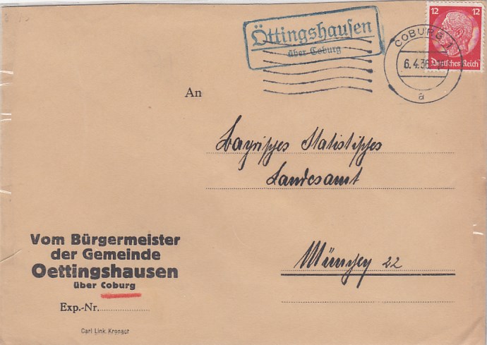 Landpoststempel auf Brief Öttingshausen Coburg Geschäftspost Bürgermeister