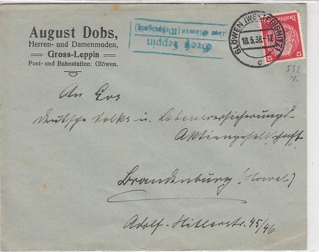 Landpoststempel auf Brief Groß Leppin Glöwen Westprignitz Geschäftspost