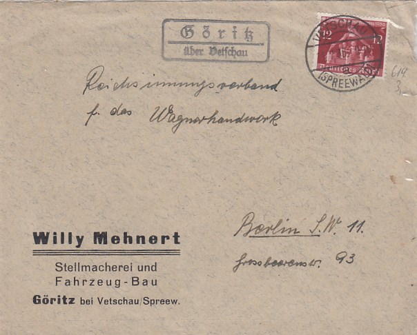 Landpoststempel auf Brief Göritz Vetschau Spreewald Geschäftspost Fahrzeug-Bau