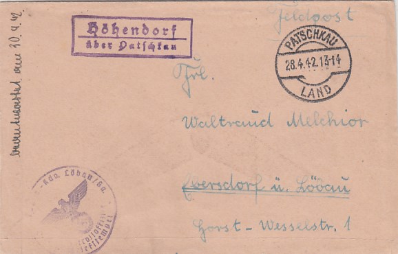 Landpoststempel auf Brief Höhendorf Patschkau Feldpoststempel 1942