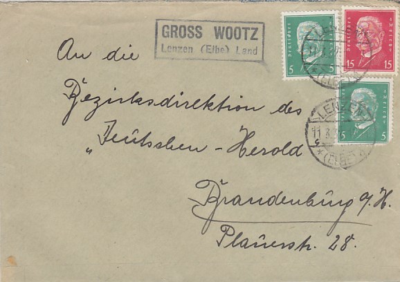 Landpoststempel auf Brief Groß wootz Lenzen an der elbe