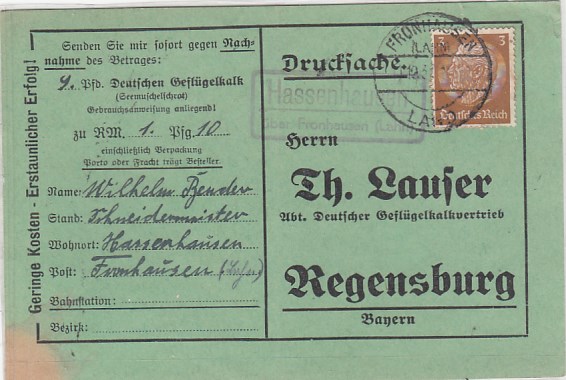 Landpoststempel Hassenhausen bei Fronhausen Lahn Geschäftspost Lauser Regensburg