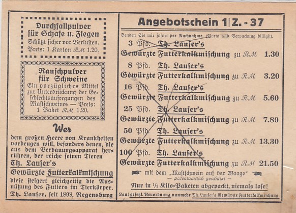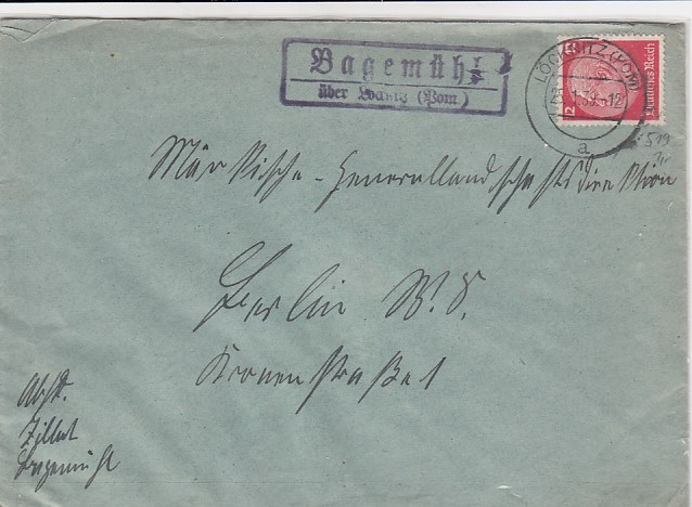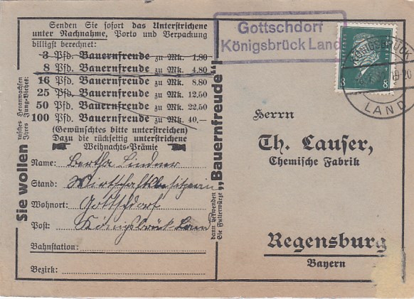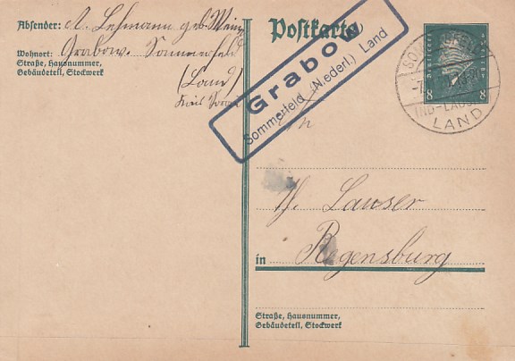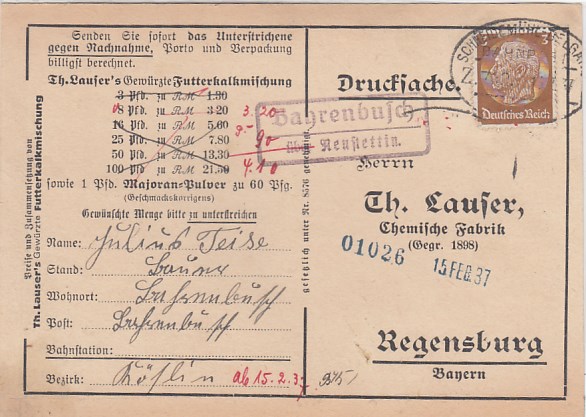 Landpoststempel Bahrenbusch bei Neustettin Bahnpoststempel Schneidemühl Geschäftspost Regensburg