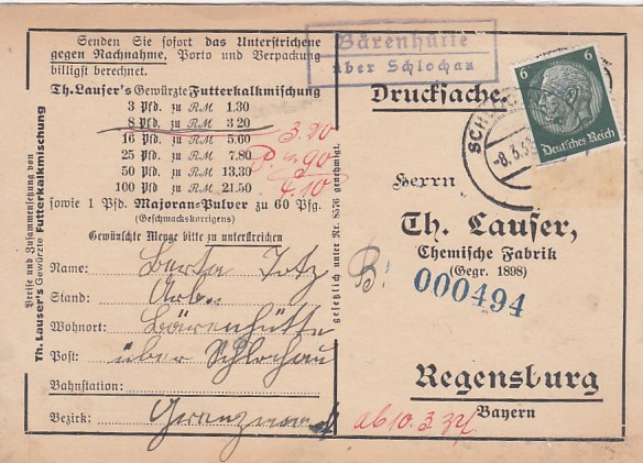 Landpoststempel Bärenhütte bei Schlochau Geschäftspost Regensburg