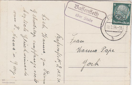 Landpoststempel Bassenfleth bei Stade 1934 auf AK Glückwunsch