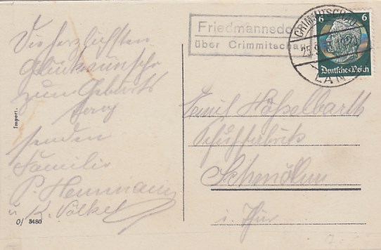 Landpoststempel Friedmannsdorf bei Crimmitschau auf Glückwunsch AK
