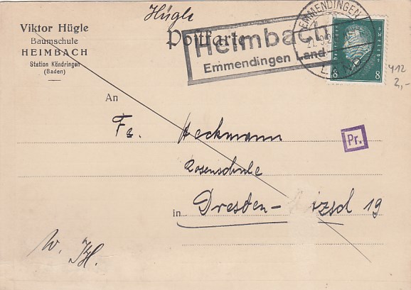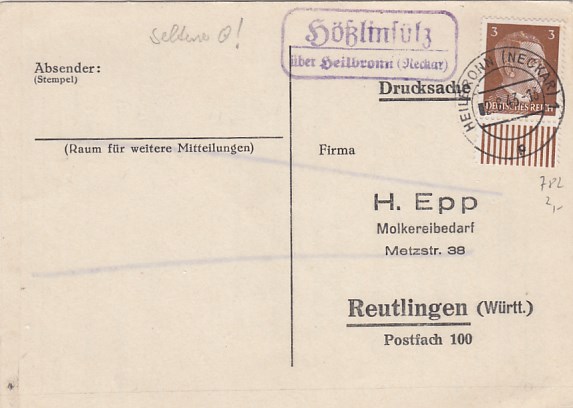 Landpoststempel Hößlinsülz bei Heilbronn Geschäftspost Reutlingen 1943