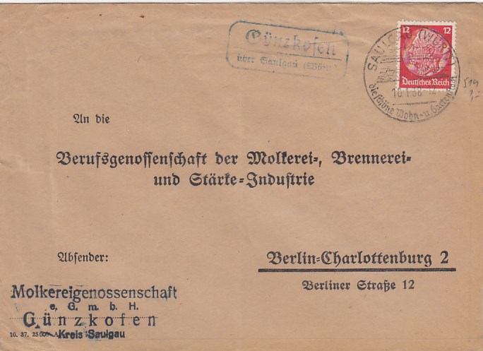 Landpoststempel auf Brief Günzkofen Saulgau Geschäftspost Molkerei
