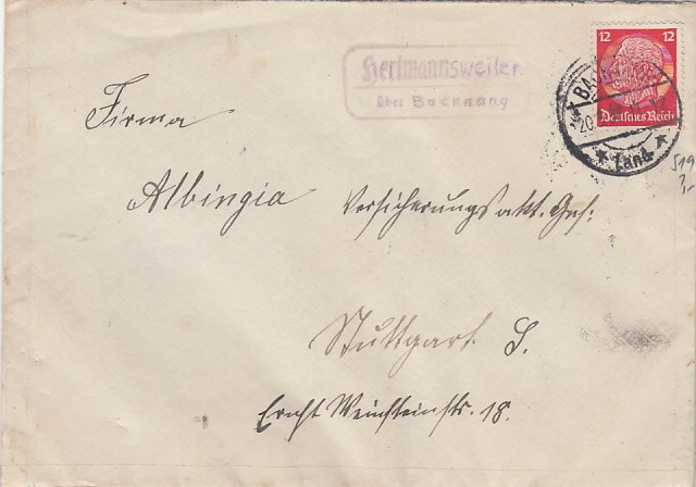 Landpoststempel auf Brief Hertmannsweiler Backnang