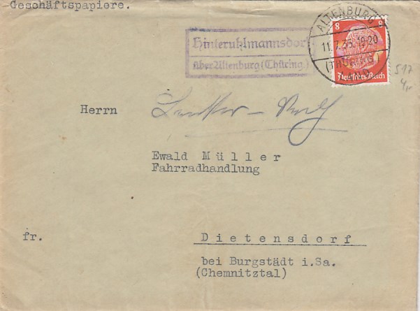 Landpoststempel auf Brief mit inhlat Hinteruhlmannsdorf Altenburg Türingen