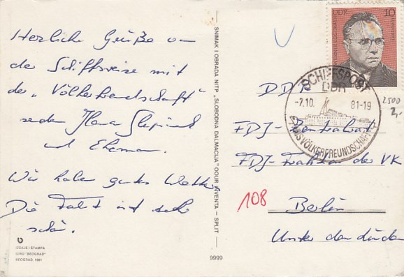 Deutsche Schiffspost Stempel DDR Völkerfreundschaft Urlauberschiff Dubrovnik