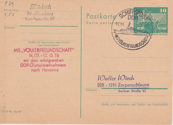 Deutsche Schiffspost Stempel DDR Völkerfreundschaft Urlauberschiff Olympiade Kuba Cuba Havanna