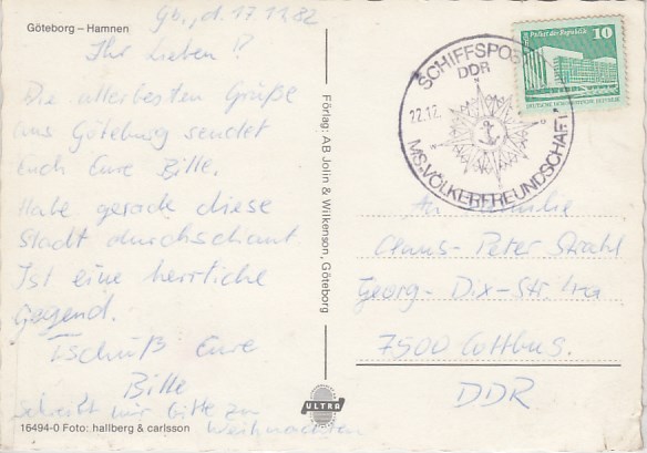 Deutsche Schiffspost Stempel DDR Völkerfreundschaft Fährschiff Stena Line Göteborg Hamnen