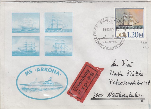 Deutsche Schiffspost Stempel DDR Urlauberschiff Arkona auf Brief Eilsendung