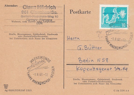 Deutsche Schiffspost Stempel DDR Fähre Warnemünde Gedser 1964