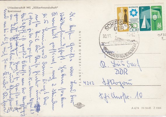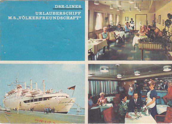 Deutsche Schiffspost Stempel DDR Völkerfreundschaft Urlauberschiff Speisesaal