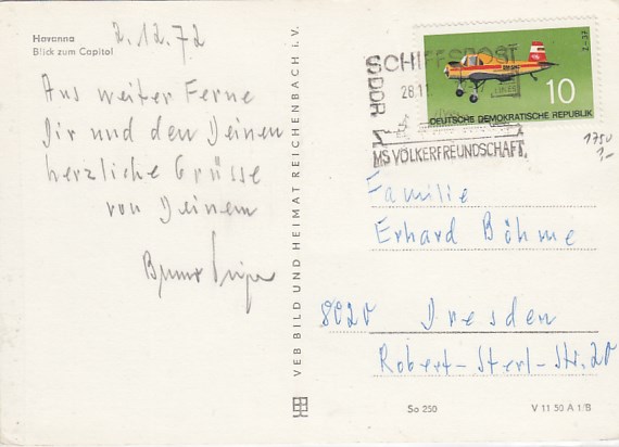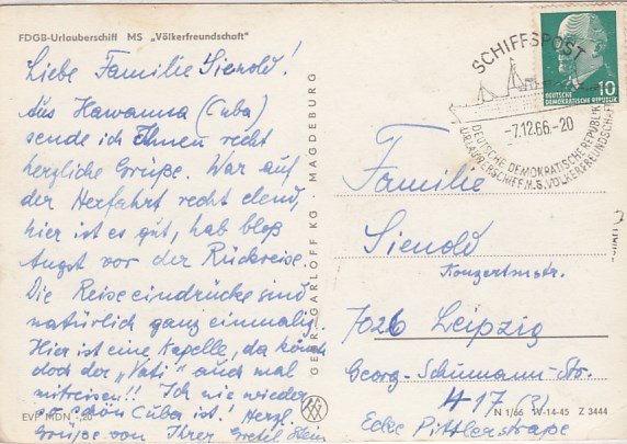 Deutsche Schiffspost Stempel DDR Völkerfreundschaft Urlauberschiff Kuba Cuba Havanna