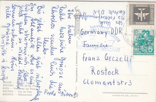 Deutsche Schiffspost Stempel DDR Völkerfreundschaft Urlauberschiff Insel Rhodos Griechenland