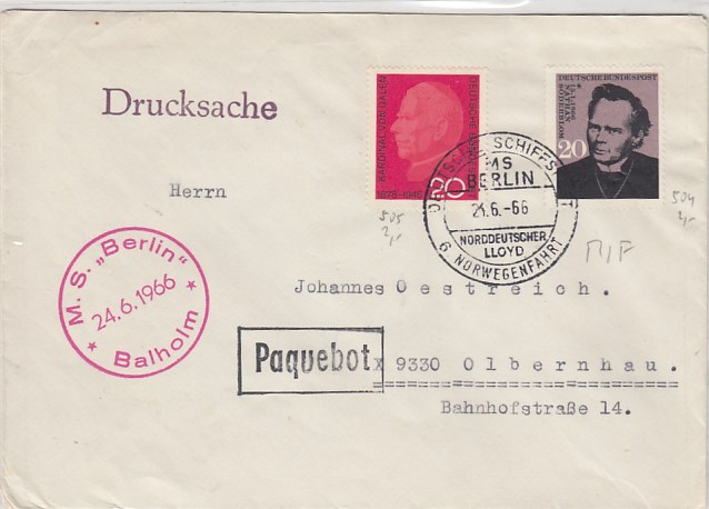 Deutsche Schiffspoststempel Norwegenfahrt 1966 M.S.Berlin Balholm nach Olbernhau Paquebot