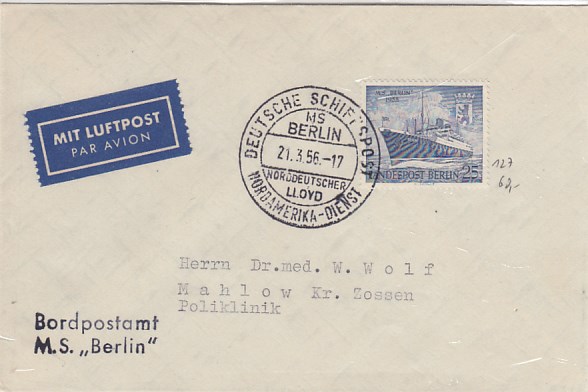 Deutsche Schiffspost Stempel MS Berlin Nordamerika-Dienst Luftpost nach Mahlow 1956
