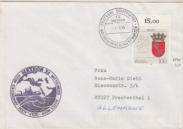 Deutsche Schiffspost Stempel auf Brief Meeresforschungsfahrt Arabisches Meer Meteor nach Franken