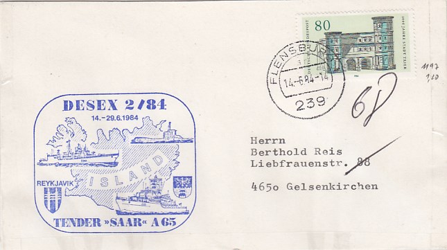 Deutsche Bundesmarine Stempel auf Brief Desex Island Tender Saar nach Gelsenkirchen