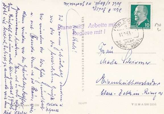 Anlaß Stempel DDR Politik auf AK Klingenthal Plane Arbeite Regiere mit