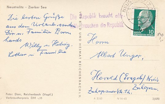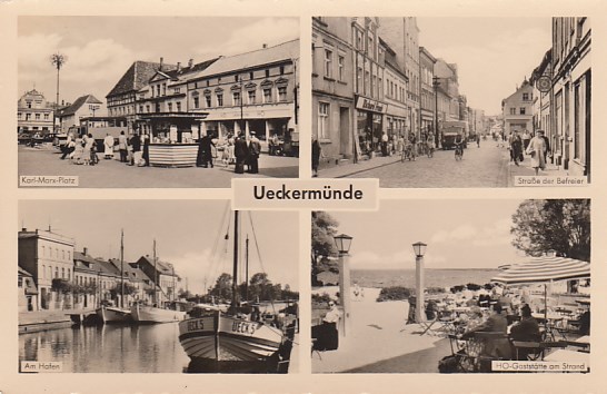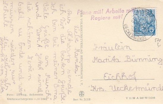 Anlaß Stempel DDR Politik auf AK Ueckermünde Plane Arbeite Regiere mit
