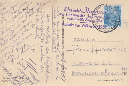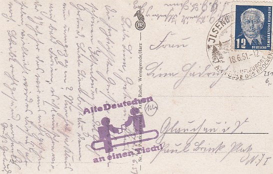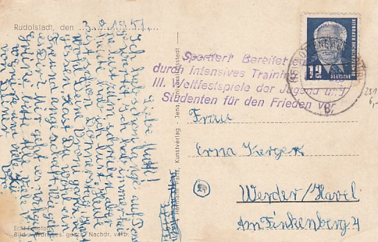 Anlaß Stempel DDR Politik auf AK Rudolstadt Sportler Welstfestspiele Jugend 1951