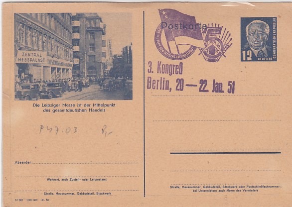 Anlaß Stempel DDR Politik auf Ganzsache Leipzig 3.Kongreß Berlin 1951