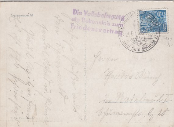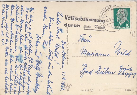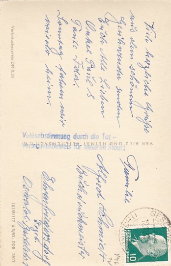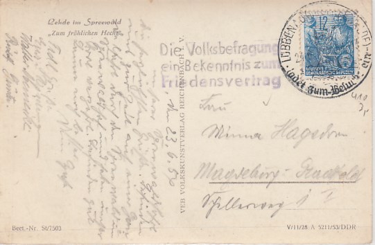 Anlaß Stempel DDR Politik auf AK Spreewald Volksbefragung Friedensvertrag