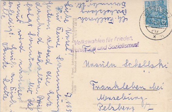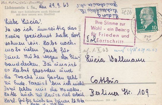 Anlaß Stempel DDR Politik auf AK Lichtenstein Sachsen Wahl Frieden und Forstschritt