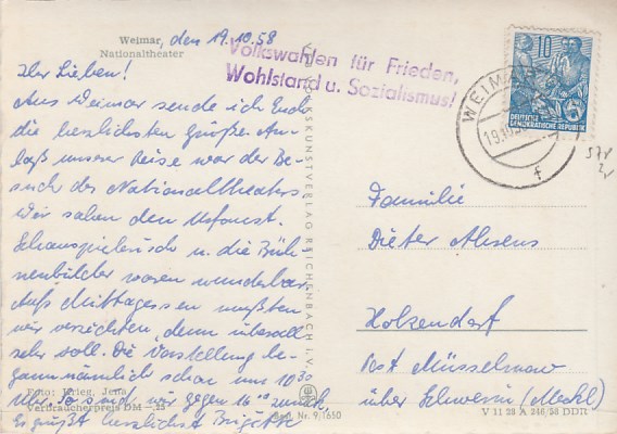 Anlaß Stempel DDR Politik auf AK Weimar Volkswahl Frieden Wohlstand